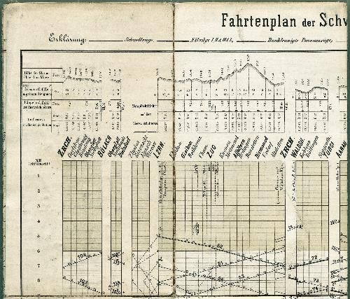 Graphischer Fahrplan der Nordostbahn (NOB)Quelle: 100 Jahre öffentlicher Verkehr im Kanton Zug, 2004, Autor: Gerhard Oswald